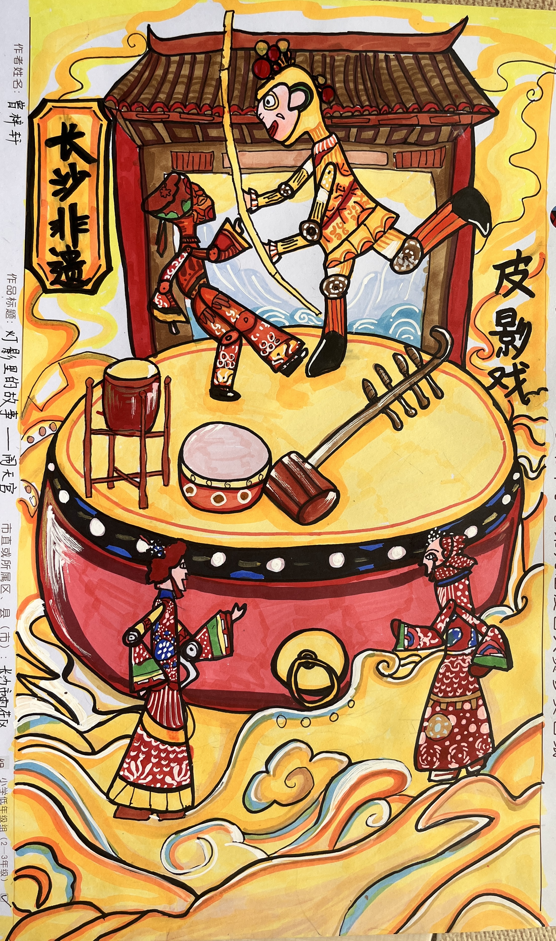 作品展示的是皮影戏“闹天宫”,湖南皮影戏是国家级非物质文化遗产代表性项目,是一种高度综合又比较独特的民间艺术形式,它有着数千年的历史传承与丰厚的文化艺术积淀,它集表演、音乐、美术等各种元素于一身,有着多层次的艺术内涵,我们应当予以传承和保护。