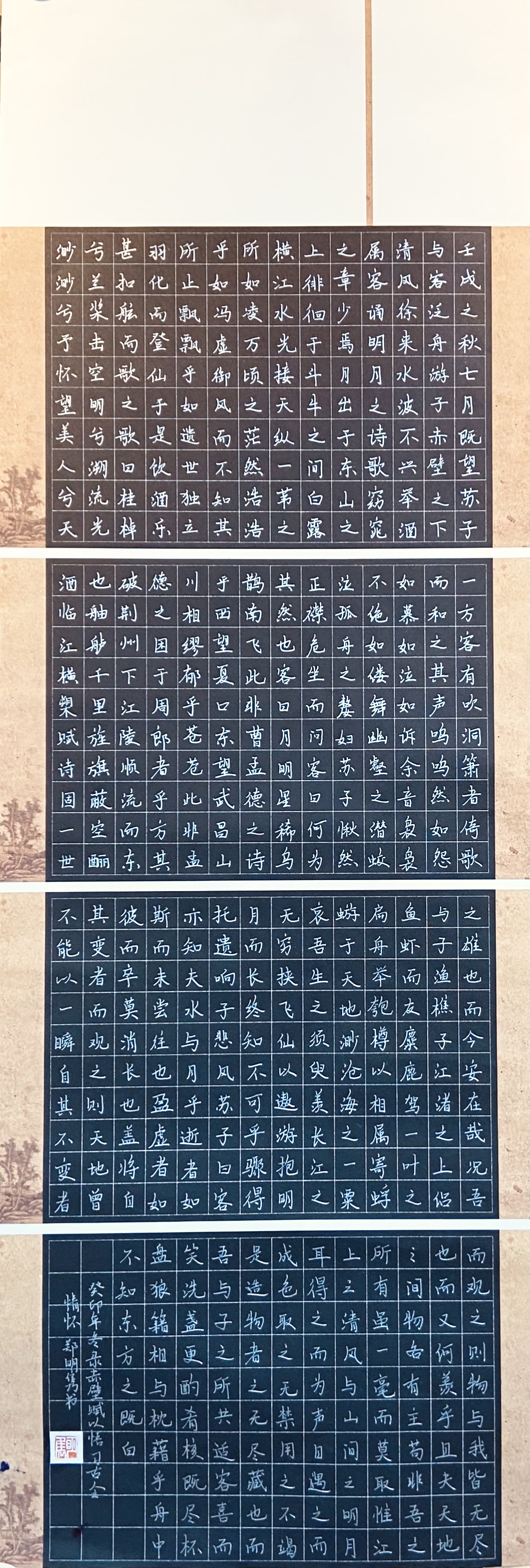 四个块面拼接在一张纸,用黑底白笔形式,用楷书书写苏轼赤壁赋。