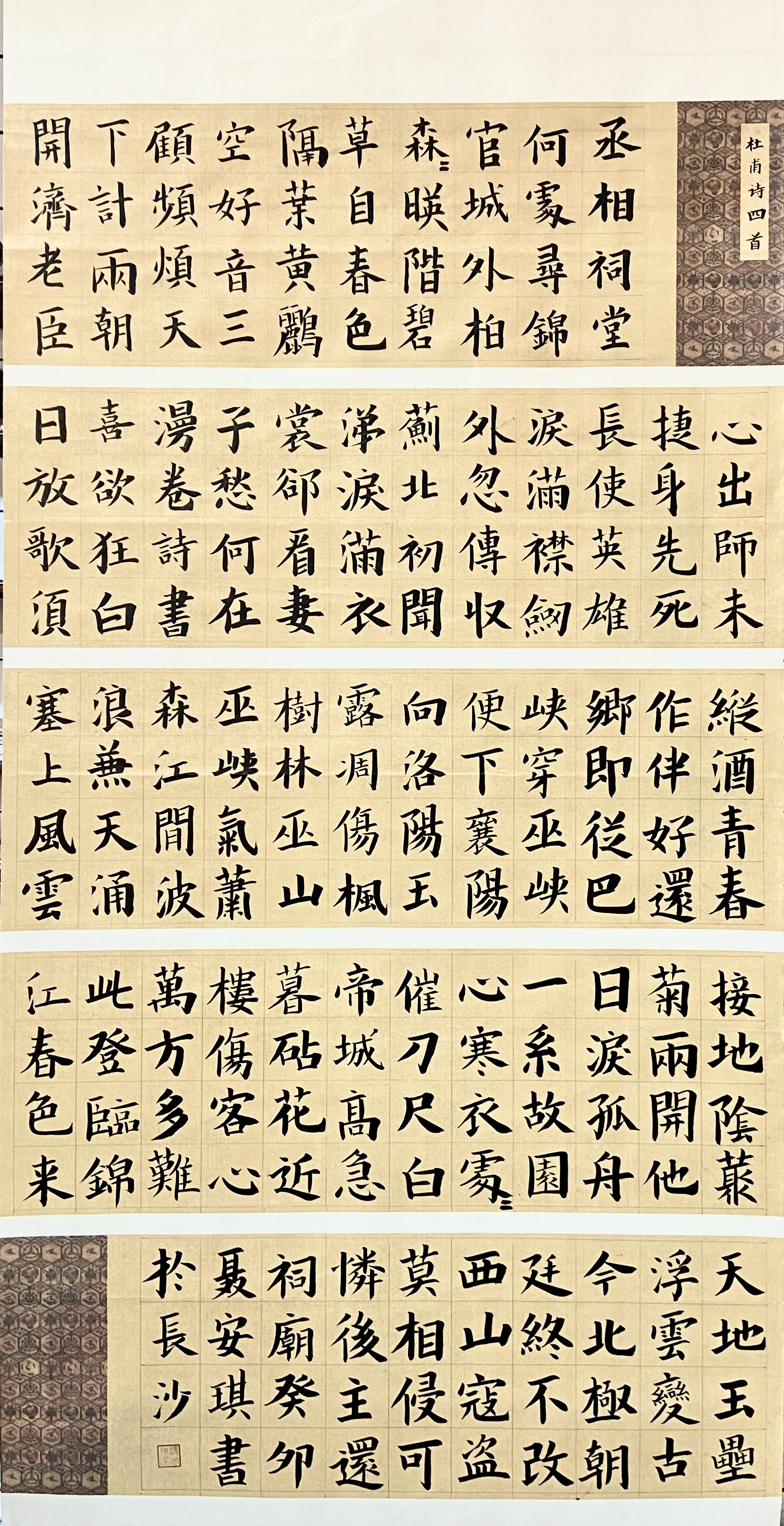 四尺整张宣纸,采用手卷拼接形式,用欧阳询楷书录杜甫四首古诗,开头用小楷书题签。