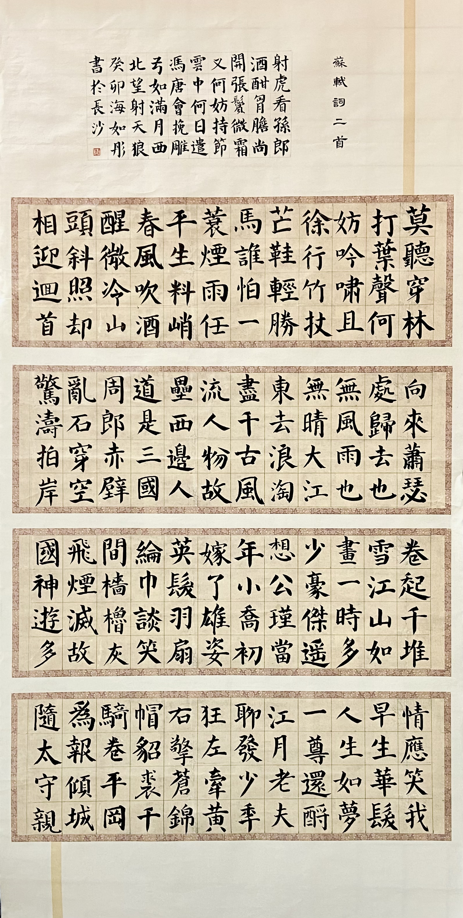四尺整张宣纸,采用手卷拼接形式。正文部分用颜真卿楷书写苏轼两首词;顶部用题跋形式,小楷续写正文内容,右边有题签,形成一个小作品。