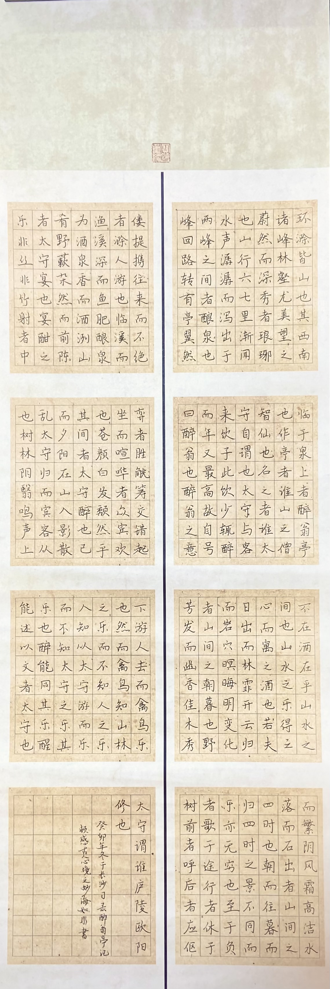 8个块面拼接在一张纸,用楷书书写欧阳修《醉翁亭记》。