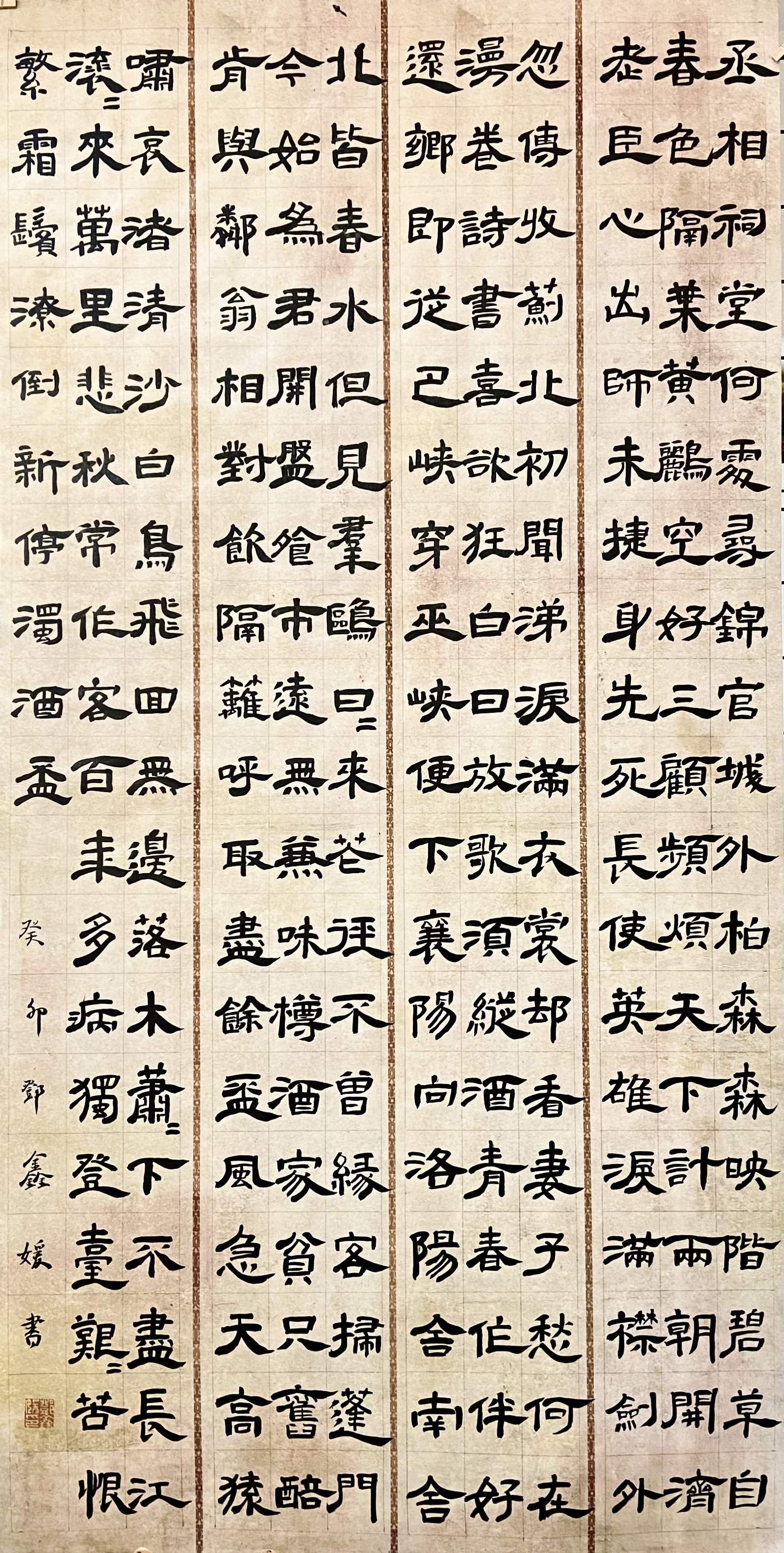 四尺整张宣纸,采用四条屏拼接形式,用隶书录杜甫四首七律,最后小行书落款。