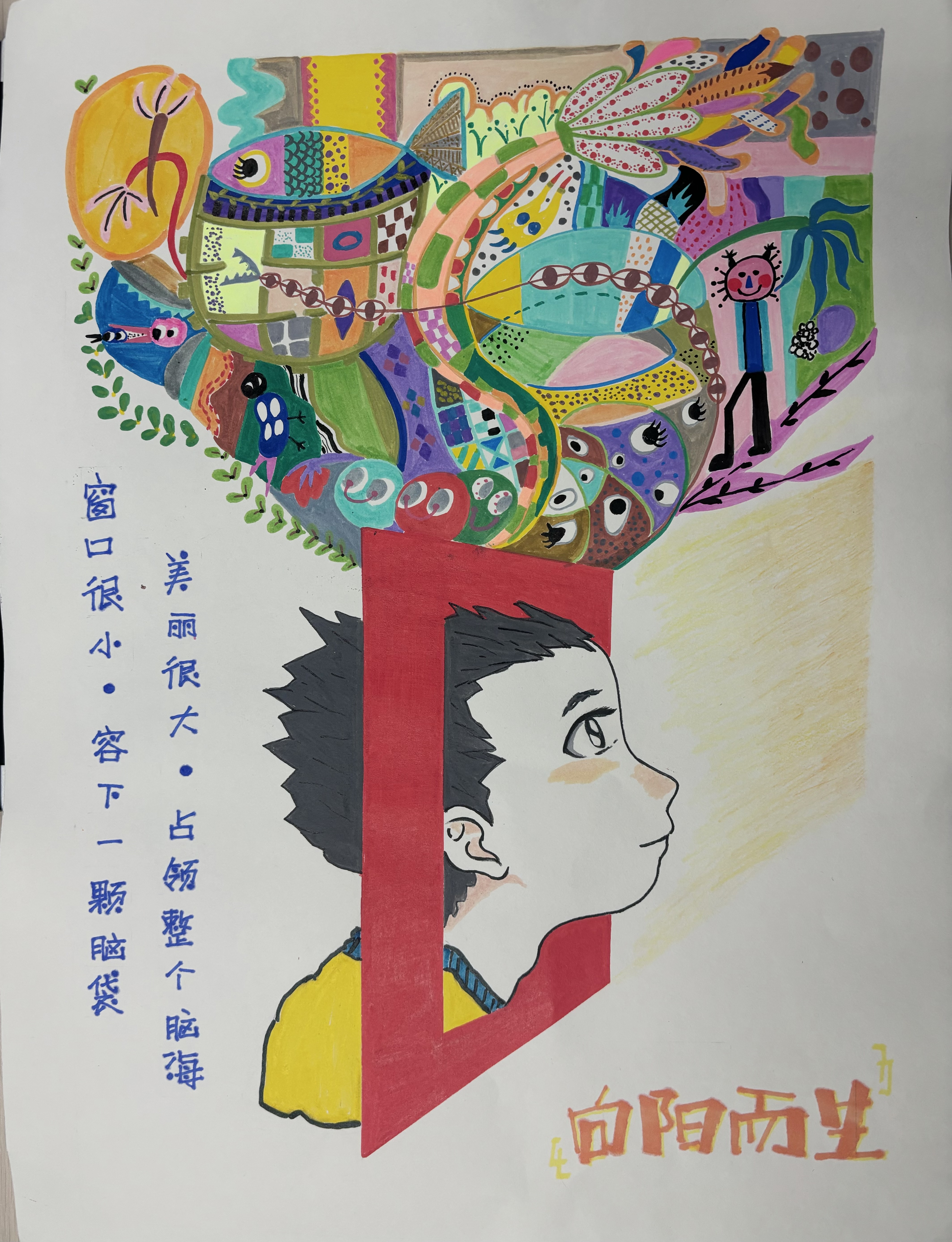 我们这一代的青少年,不仅学习课本上的知识,更要突破自己,推开一扇又一扇的窗户,追着光,打开眼睛,去认识美丽而充满无限可能的世界,因为,我们的未来有无限可能,作品描绘了一个少年伸出窗外,红色的窗口代表了希望,他看到了更精彩的世界,有生命之树,永恒之花,太阳里的图腾,还有无数双明亮的眼睛,正在眺望这个色彩缤纷的世界