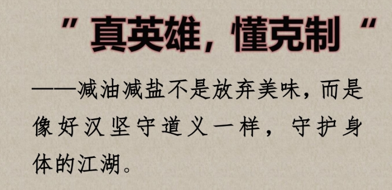 作品中为守护健康江湖,众好汉立下三条“轻食江湖令”:严控食盐(≤5克/人/日)、弃油炸改蒸煮、荤素合理搭配。通过将经典人物深度绑定健康技巧,江湖语言趣味化科普,情景剧式互动传递知识,并提炼“盐多必失”、“油猛如虎”、“天然调味救急”等易记口诀。通过“镇得住江湖,管得了油盐”的英雄新形象,生动传递低盐低脂饮食对预防高血压、心血管疾病等的重要性,倡导健康生活方式,寓教于乐,印象深刻。