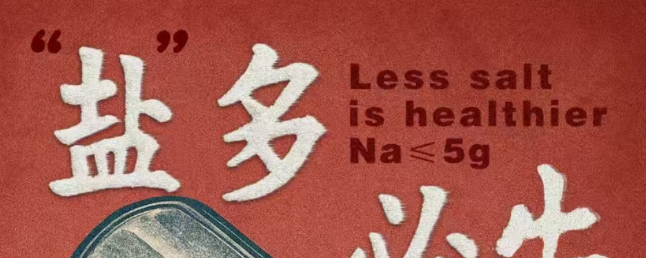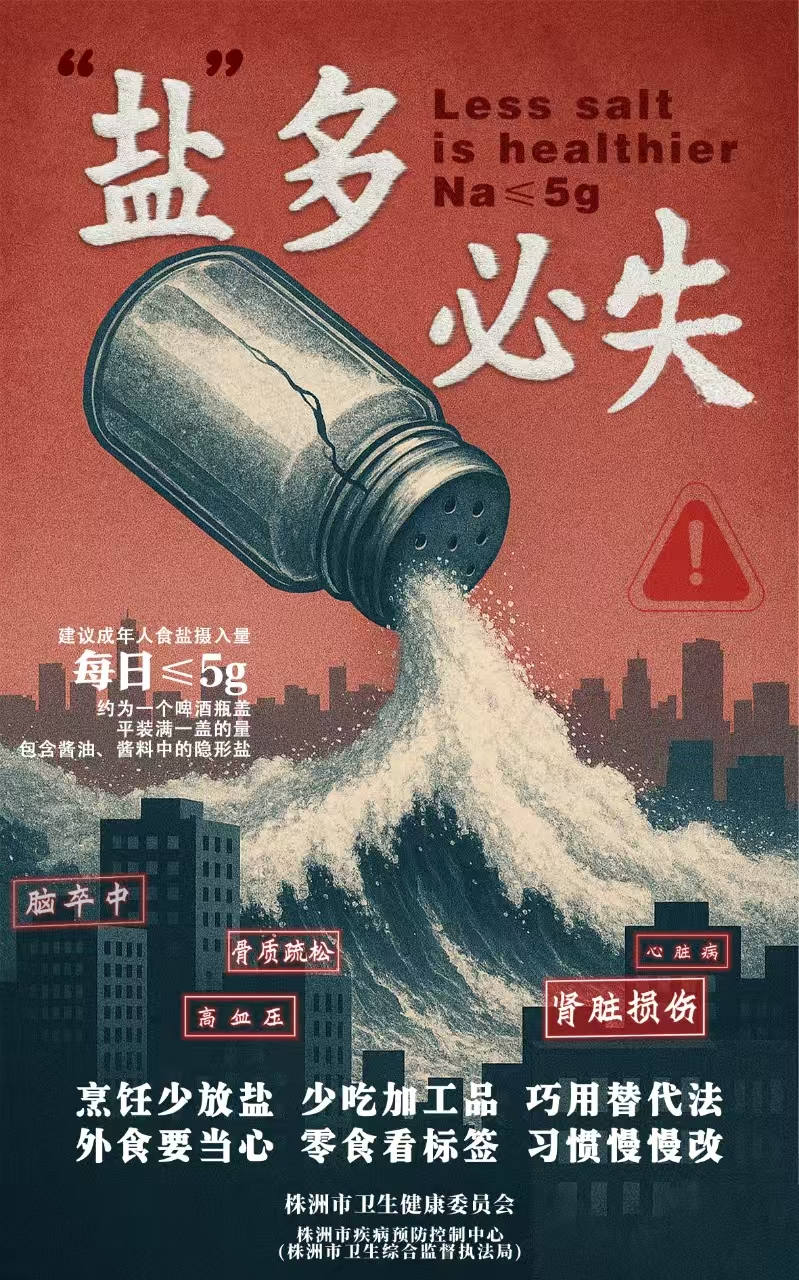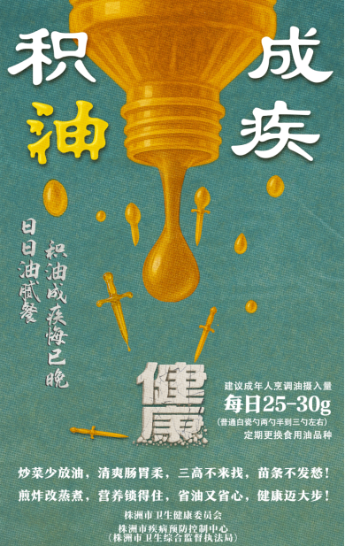 高盐高油海报,主要体现日常生活中吃多了油和盐对健康的危害,并把国家推荐成人每天的油和盐的用量用日常可见的啤酒瓶盖和白瓷勺具体化。图面设计把多油化作利剑飞向健康,多盐变成海啸淹没房屋,来体现高盐高油对健康的伤害有多大,形象生动,让人一看非常有震慑力。海报主题“积油成疾”“盐多必失”妙改成语,让人容易牢记心中。系列副标以顺口溜的形式体现,郎朗上口:烹饪少放盐,少吃加工品,巧用替代法,外食要当心,零食看标签,习惯慢慢改。炒菜少放油,清爽肠胃柔,三高不来找,苗条不发愁!煎炸改蒸煮,营养锁得住,省油又省心,健康迈大步!