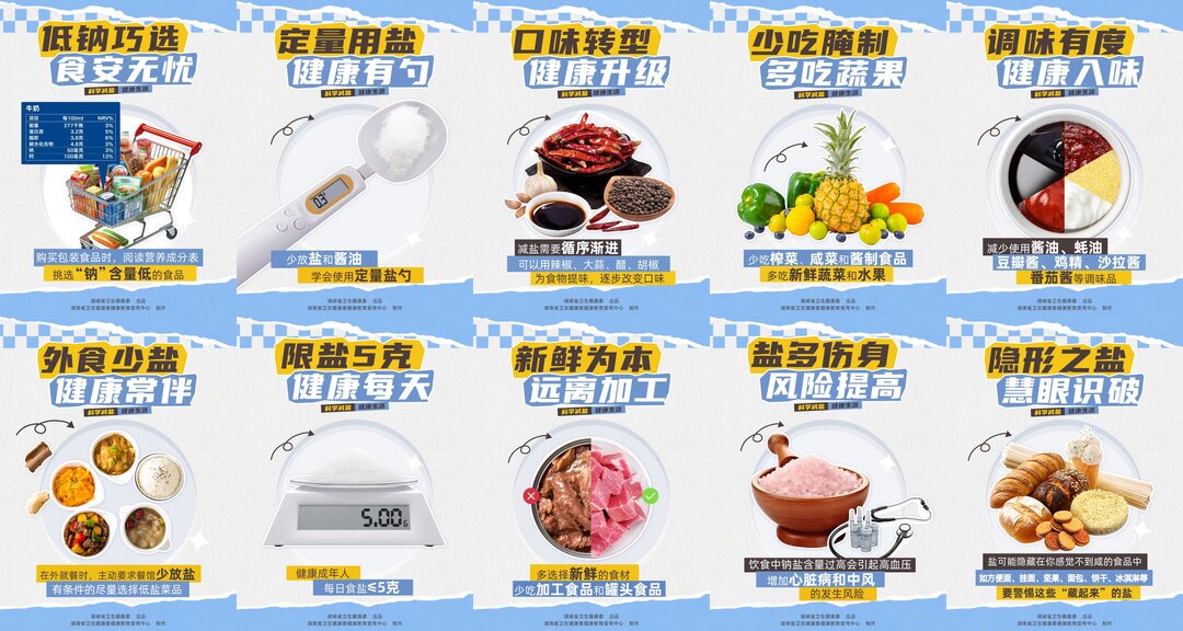《减盐减油宣传系列海报》共计20幅,聚焦大众健康的关键痛点,以清晰且直观的呈现形式普及减盐减油相关知识。该系列海报围绕“科学减盐减油”这一核心主题构建了完整的内容体系,海报整体设计简洁明了、易于理解,信息传递高效,有助于公众迅速掌握减盐减油的关键要点,推动形成低盐少油的饮食习惯。