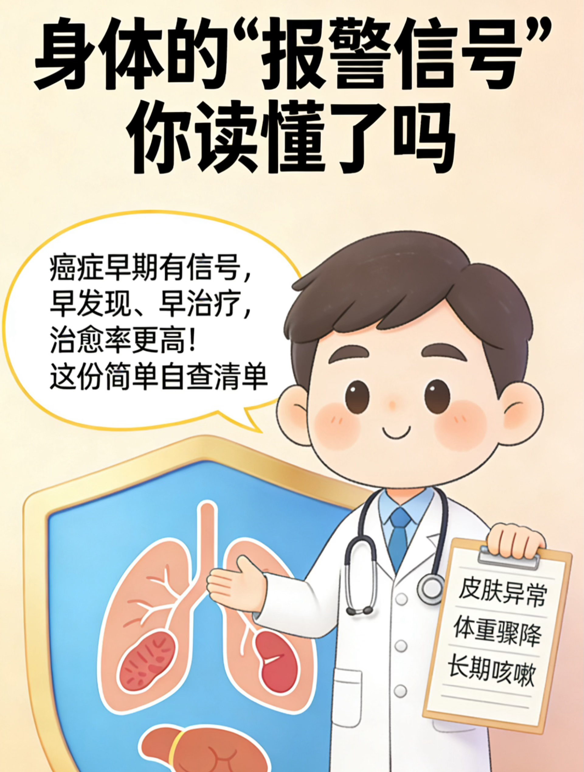 这是一份大众癌症早期信号自查图文清单,涵盖皮肤、消化、排便、全身等异常表现。信号不等于确诊,但持续超2周请及时就医;早筛早治更易治愈,健康生活+定期体检更靠谱。