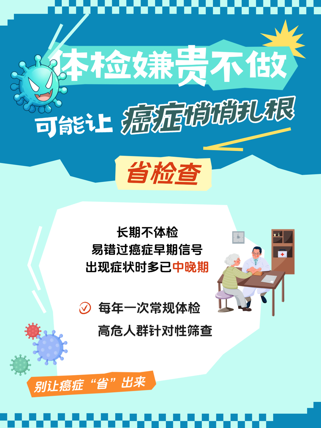 本作品围绕”别让错误节俭养出癌症”这一核心,聚焦日常中省吃、省菜、省电、省检查、省运动、省时间六大常见习惯,用直白易懂的海报,科普背后隐藏的致癌风险。海报内容科学严谨、警示清晰、贴近生活,将专业防癌知识转化为实用健康提醒,呼吁大家远离不良生活习惯,做到早预防、早重视,把健康真正放在第一位。