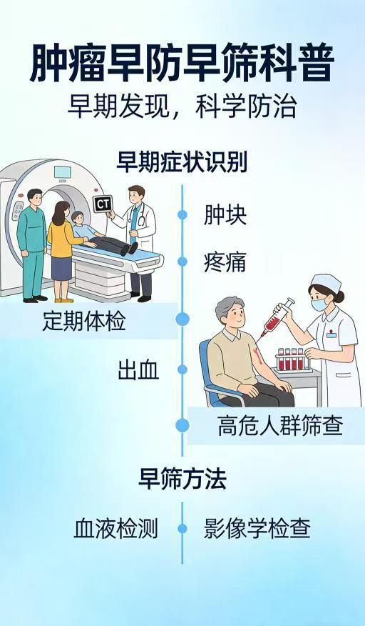 通过图文的形式讲述肿瘤早筛、早防的重要性,包括早发现 治愈率的提升、早治疗5年生存率的提升及早期症状的识别及 早筛方法
