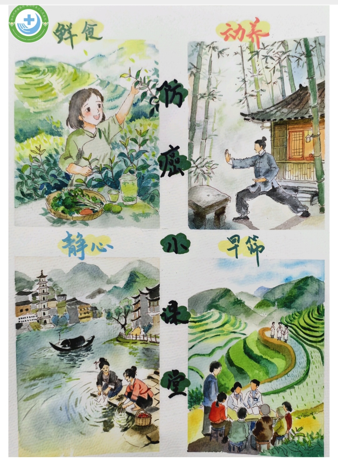 这幅作品以湖南特色的水彩画风,将“防癌小课堂”融入鲜活的湖湘生 活场景,生动诠释了“鲜食、动养、静心、早筛”四大防癌理念。画面 左上,女子在田间采摘新鲜蔬果,体现“鲜食”之道,倡导多吃天然食 材,远离加工食品;右上,男子在竹林间习练太极,展现“动养”之法 ,强调适度运动可增强体质、抵御癌邪;左下,水乡女子浣洗劳作,背 景是静谧的古镇风光,传递“静心”之境,提醒人们舒缓压力、保持平 和心态;右下,医护人员深入田间地头,与村民围坐交流,践行“早筛 ”之举,凸显早发现、早诊断、早治疗的重要性。